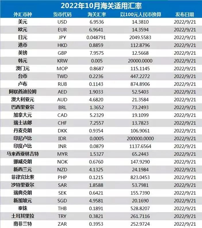 10月海关适用汇率